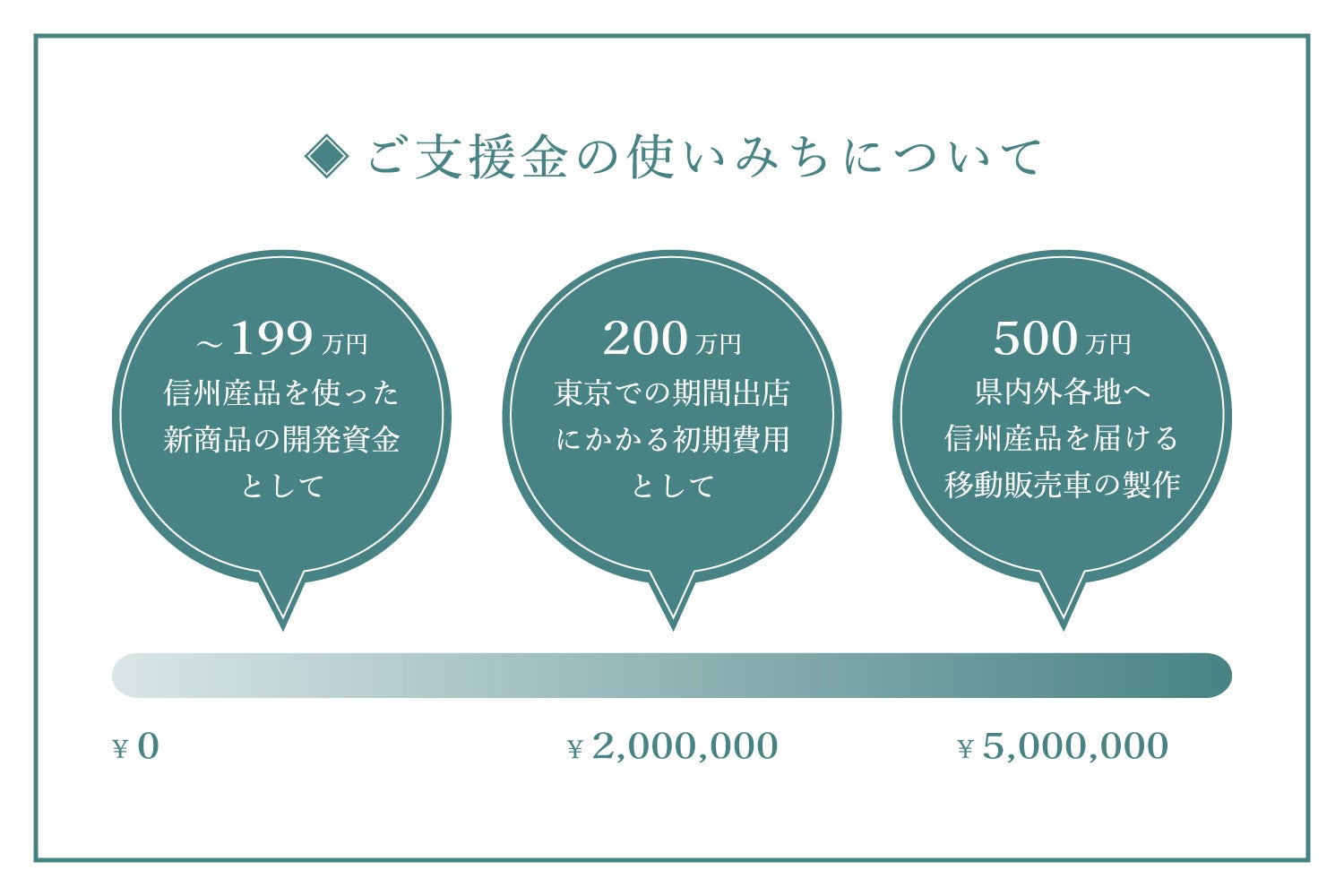 当社は今後も、感染症対策に十分配慮した上でイベント等への出店を継続していく予定であり、2021年度中に東京都内の一等地にある百貨店から期間出店のお話をいただいています。現時点では検討中の段階ですが、クラウドファンディングの目標金額に設定した200万円を達成した際には、出張出店の初期費用《商品仕入費、運送費、交通費、備品購入費など》に充てさせていただきます(なお、ご支援総額が200万円に達しない場合には、信州産フルーツを使った新たな商品開発の費用に充てさせていただきます)。