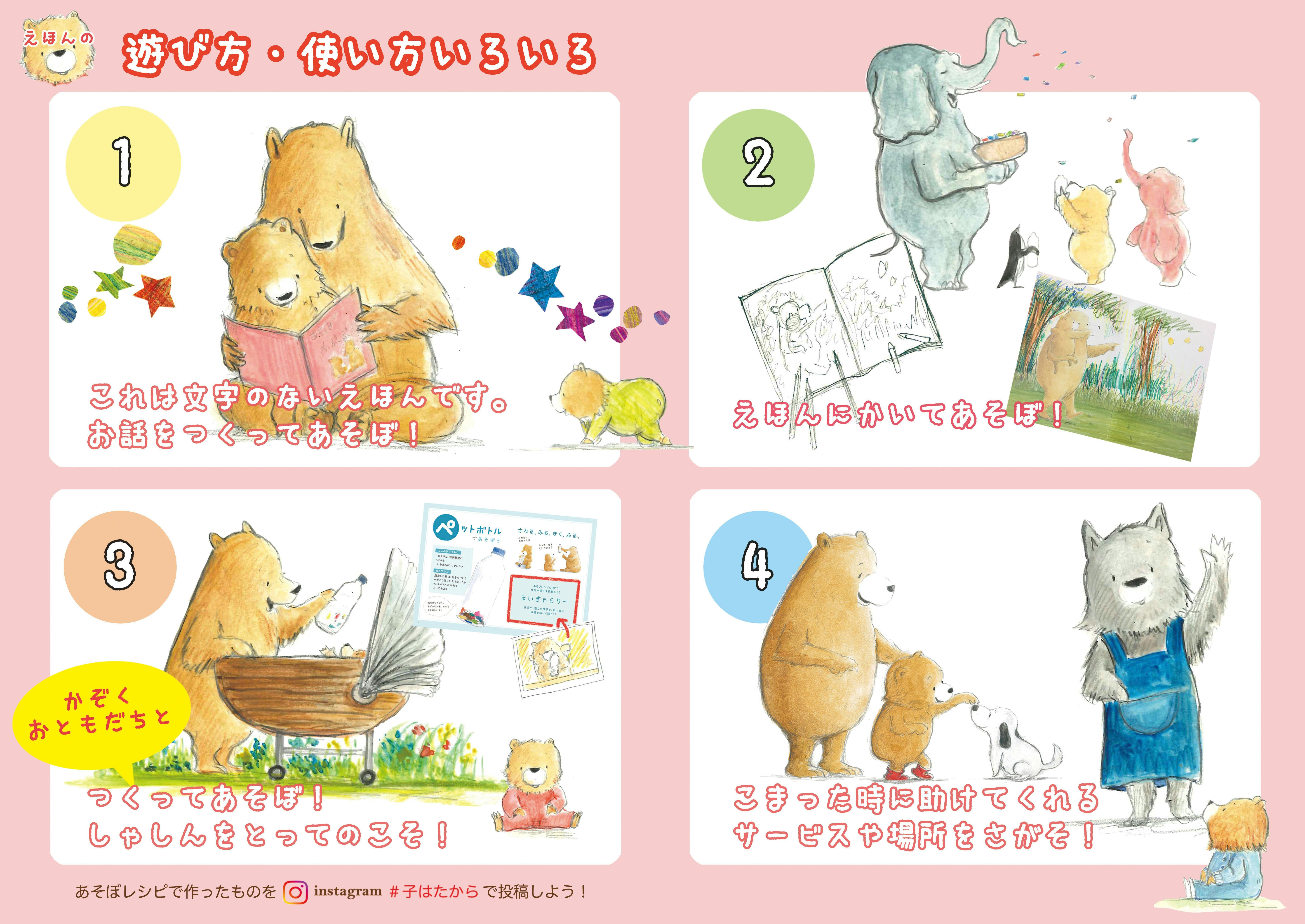 安心して前向きに親子関係を深める遊びの紹介や、関わり方のヒント、支援者との関係づくり、支援を受けられる環境づくりをお手伝いするツールとして、子はたからプロジェクトの「あそぼレシピ」絵本セットをプレゼントしています。※赤ちゃん訪問時の保健師からの直接案内や、子育て支援拠点(広場)のイベントなどで利用されています。