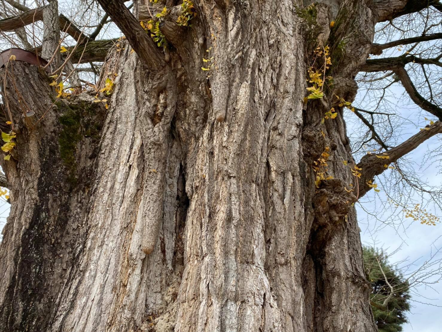 樹齢1250年、高さ28メートルにも及ぶ大きな大きなイチョウの木。国指定の天然記念物でもあります。木には気根(きこん/地中ではなく、空中に露出している根っこ)が多数見られ、その形状が乳の形に似ていることから、いつしか「乳(ちち)の木」や「乳(ちち)イチョウ」とも呼ばれるようになりました。