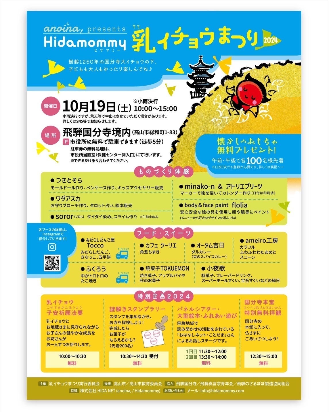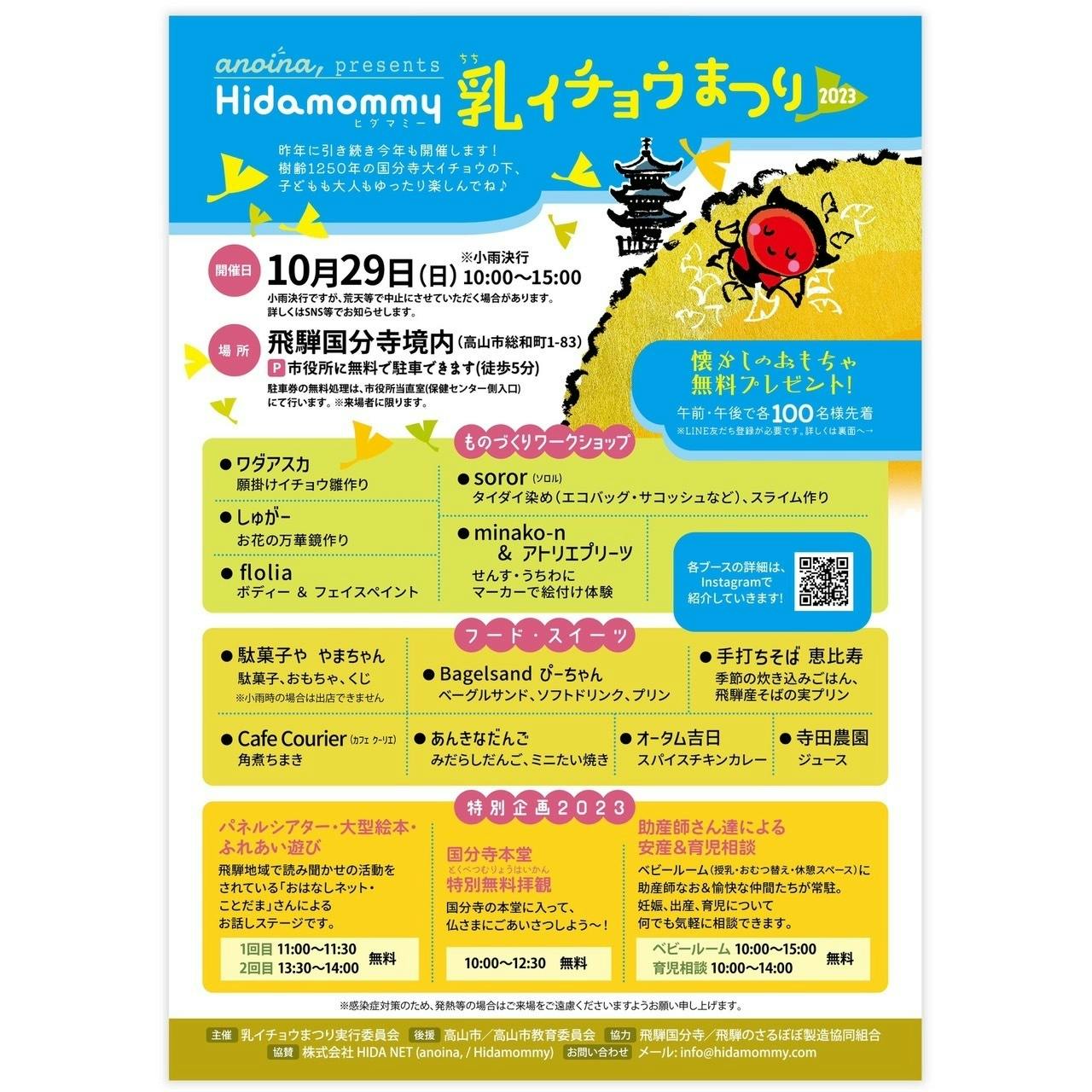 2024/10/02 19:45毎年多くの子どもたちやファミリーに来ていただいているイベント「乳イチョウまつり」、2024年もぜひお越しください!■開催日時:10月19日(土曜日)10:00〜15:00 ※小雨決行■開催場所:飛騨国分寺(高山市総和町1-83)■参加費:入場無料■駐車場:高山市役所に無料で駐車できます。駐車券の無料処理は、市役所当直室(保健センター側入り口)にてお願いします。※できるだけ乗り合わせてお越しください※国分寺には駐車できませんのでご注意ください大きなイチョウの木の下で子どもたちがのびのび遊べる飛騨国分寺にある樹齢1250年の大イチョウ。子どもも大人もゆったり楽しめるイベントです【ものづくりワークショップ】小さいお子さまや小学生が楽しめるブースです。・つきとそら:モールドール作り、ペンケース作り、キッズアクセサリー販売・ワダアスカ:お守りブローチ作り、タロット占い、絵本販売・soror(ソロル):タイダイ染め、スライム作り ※午前中のみの出店・minako-n&アトリエプリーツ:マーカーで絵を描いてカレンダー作り・ボディ&フェイスペイントflolia:安心安全な絵の具を使用した顔や腕などへのペイント【フード、スイーツブース】子どもも大人も楽しめるメニューでお出迎え!・Tocco:みだらしだんご、きなっこ、五平餅・ふくろう:中がとろとろのたこやき・カフェクーリエ:角煮ちまき・オータム吉日:ダルカレー(豆のスパイスカレー)・ameiro工房:カラフルふわふわわたあめとスコーン・小夜歌:駄菓子、フレーバードリンク、スーパーボールすくい、宝石すくいなど【特別企画】・乳イチョウ子安祈願法要(参加無料)乳イチョウとお地蔵さまに見守られながらお子様の健やかな成長をお坊さんがお一人ずつお祈りします。10:00〜10:30・謎解きスタンプラリー(参加無料/先着200名)スタンプを集めながらお寺を探検!完成したらお菓子がもらえるかも?!・パネルシアター、大型絵本、ふれあい遊び(参加無料)昨年も盛り上がったおはなしネット・ことだまさんによるお子様向けの楽しい時間です。1回目 11:30〜12:002回目 13:30〜14:00・国分寺本堂特別無料拝観国分寺の本堂に入って仏さまにごあいさつしよう!12:30〜15:00さらに嬉しい、昔懐かしのおもちゃプレゼント午前・午後の来場者さまそれぞれ先着100名様に、昔なつかしいおもちゃをプレゼントします※ヒダマミー&姉妹サイトanoina,のLINE友だち登録が必要です国分寺の乳イチョウとは?樹齢1250年、高さ28メートルにも及ぶ大きな大きな国分寺のイチョウの木。国指定の天然記念物でもあります。木には気根(きこん/地中ではなく、空中に露出している根っこ)が多数見られ、その形状が乳の形に似ていることから、いつしか「乳(ちち)の木」や「乳(ちち)イチョウ」とも呼ばれるようになりました。【どうかこの子が健康に育ちますように】【かわいい赤ちゃんを授かりますように】【元気な赤ちゃんが生まれますように】【あの子も、この子も、私も、みんな幸せでありますように・・・】いつの時代も変わらないこの願い。それを受け止める「乳イチョウ」の存在や「乳信仰」についてもっと多くの方に知っていただきたい、悩みを持つ人たちの心の支えとなる場所を作りたい、と考え、Hidamommyでは2020年クラウドファンディングでご支援いただき、地元アーティストによる絵馬と飛騨産業さま制作の絵馬棚を国分寺のご協力のもと作成しました。そんな乳イチョウのある国分寺の素敵な空間で開催されるこのイベント!ぜひご家族やお友達と遊びにいらしてください! もっと見る