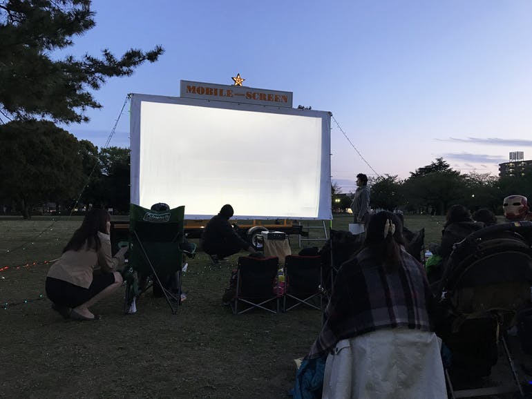 例2:スクリーンを設置し白黒無音映画を夜に流す