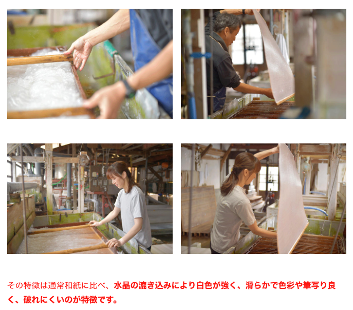 「水晶和紙」は山十製紙の職人さんが幾重にもかかる手漉きの行程で、一枚一枚丹念な作業で仕上げています。
