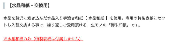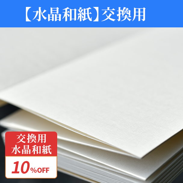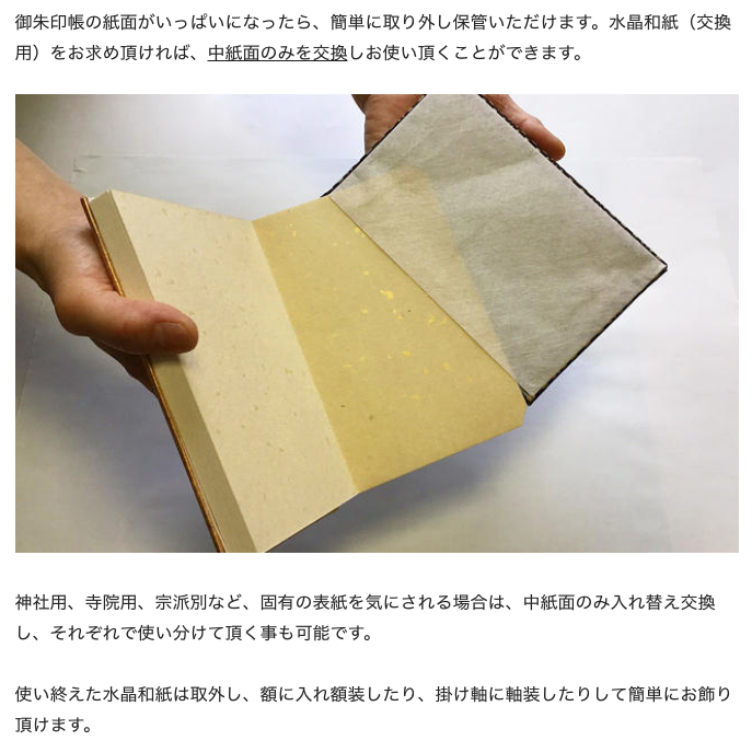 使い終えた「御朱印帳」の紙面のみを交換する事ができ、水晶和紙(交換用)をお求め頂ければ、愛着ある特製表紙の御朱印帳を末永くご愛用頂けます。