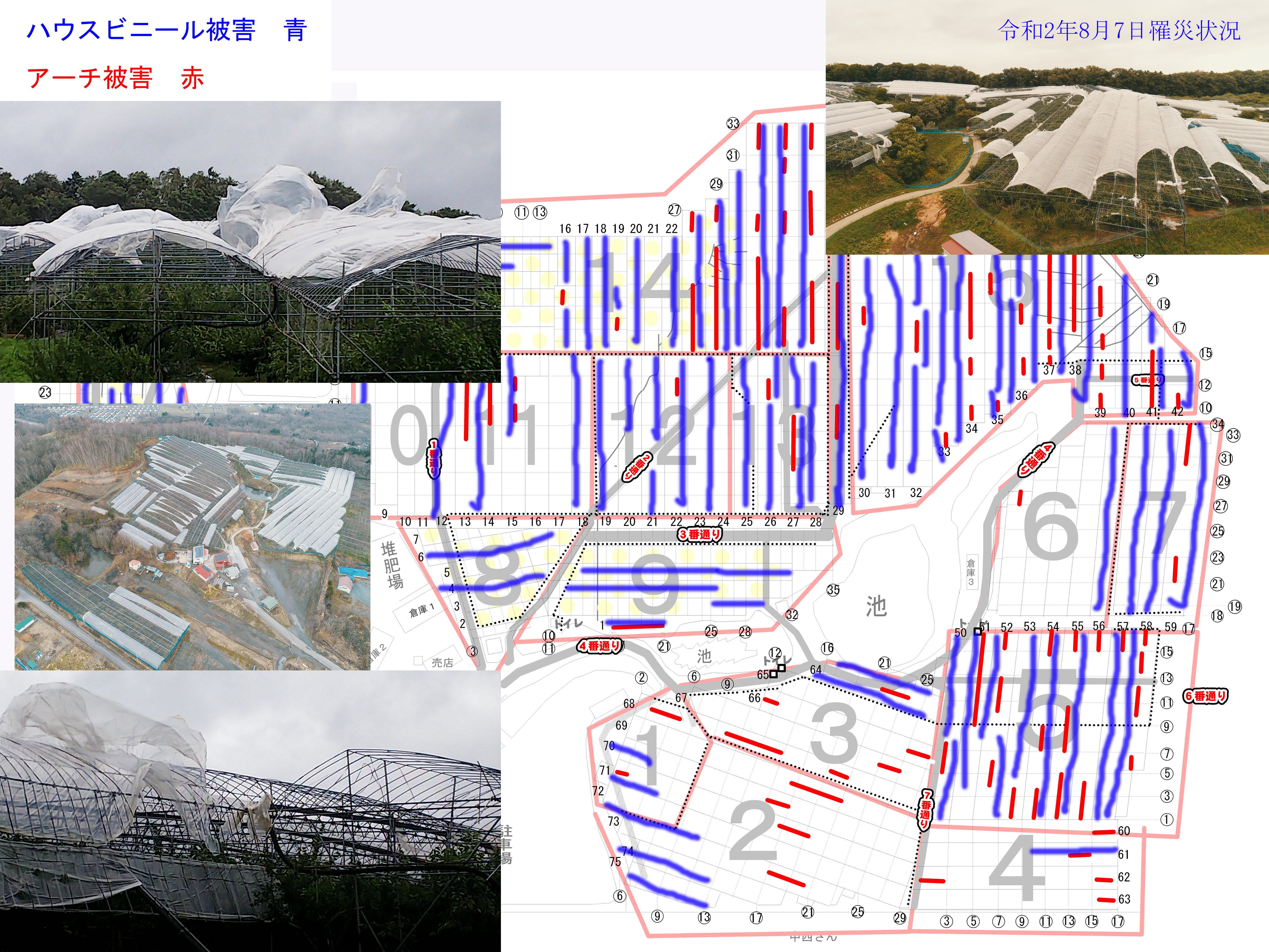 アーチがみるみる内に上から押し付けられるように風で潰され、その被害面積は当園の畑の面積の4分の1(約1.3ヘクタール)となりました。まだ確定はしておりませんが、その被害額はアーチ代と修繕の為の人件費でおおよそ600万円ほどになると思います。