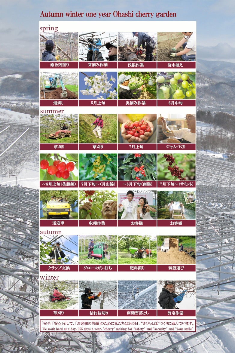 そして私たちの作るさくらんぼを召し上がった際にはその美味しさに『感動』していただける事を願いつつ、日夜こだわりの農法に取り組んでいます。感動していただけるほどのさくらんぼに育てるには、それだけの努力が必要です。どんなにつらくてもスタッフ一人一人がお互い励まし合いながら、お客様に喜んでくださる笑顔を思い描きながら1年間作業しております。