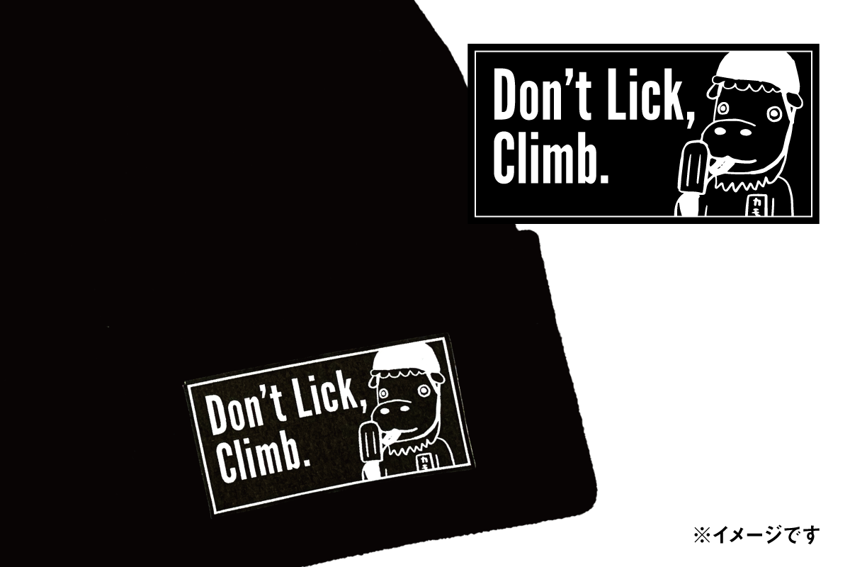 カモシーの名セリフ「山なめんなよ」をセルフオマージュした「Don't LICK, CLIMB.」。「なめずに登れよ」のメッセージを放つ一方でマイペースに"アイスキャンディ"をペロペロする冬山仕様のカモシーデザインです。安全登山へのメッセージとポップなカモシーとをイラスト化した山好きのための限定アイテムをぜひ山でも街でも!