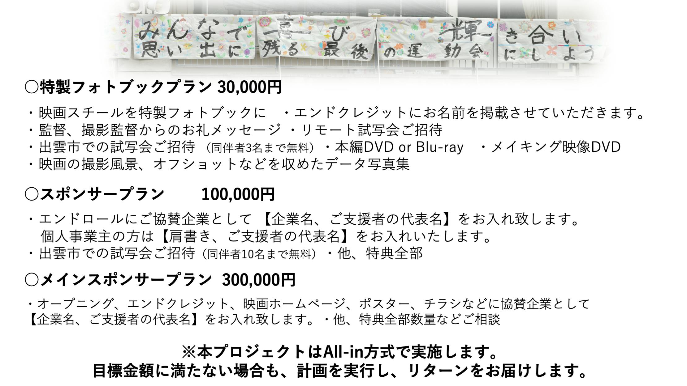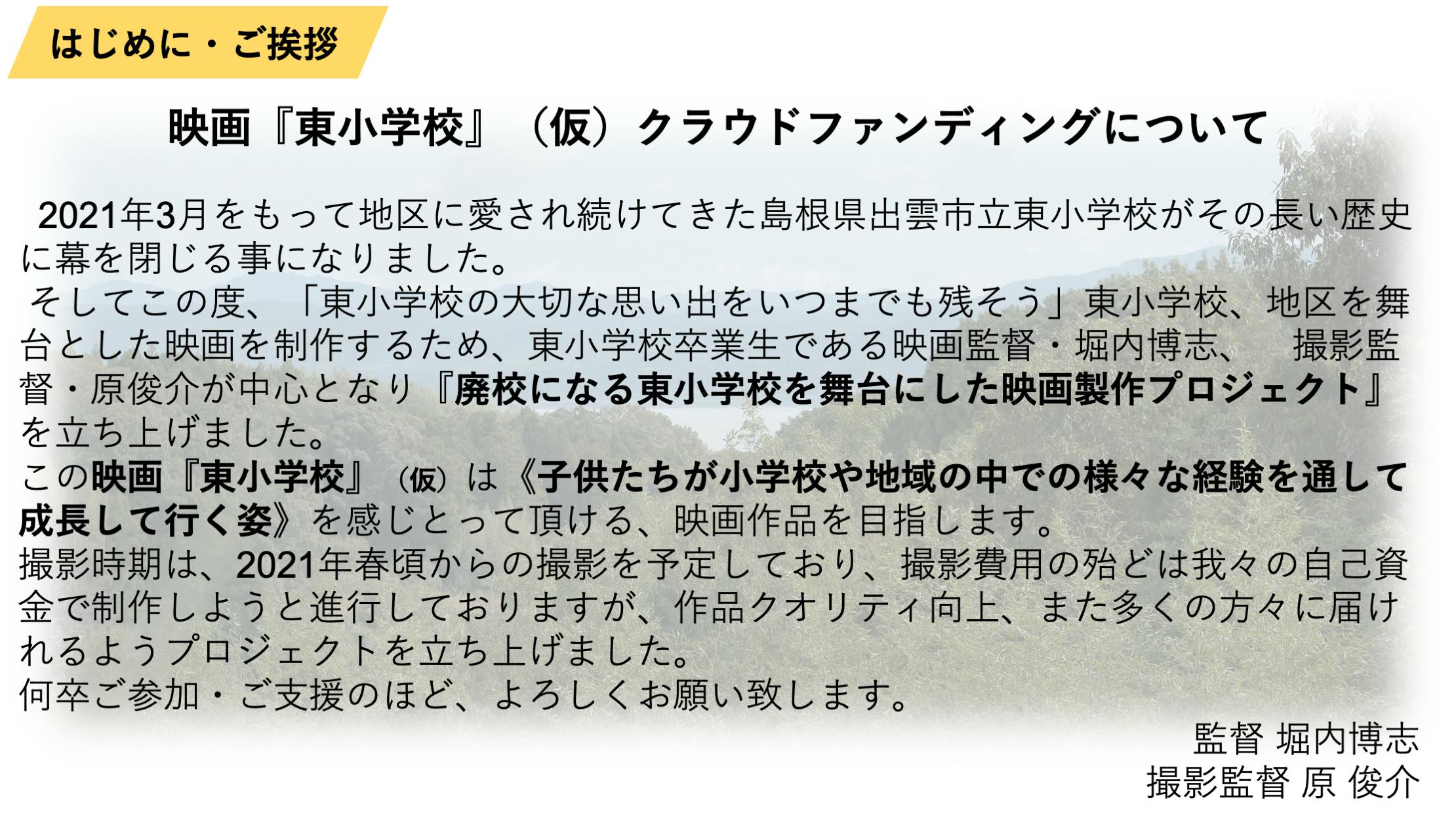 2024/06/27 01:39近況報告が遅くなってしまい申し訳ありません。現在、映画「東小学校」を国内外の映画祭に出品し、順次報告を待ちながら、広島、福山での上映、返礼品のDVD等の製作を進めております、返礼品をお待ちのみなさま遅くなってしまい申し訳ありません、もうしばらくお待ちください。上映会6月29日、広島会場、30日福山会場、それぞれ1日限りの上映になります。今後、全国各地の映画館での上映を目指し、交渉をしております。上映会等の詳細は映画「東小学校」のHPでご確認頂きますよう、よろしくお願いいたします。映画「東小学校」HP映画祭につきましては、出品しておりました、「19th JAPAN FILM FESTIVAL LOS ANGELES 2024 」にて、長編部門で入賞いたしました。9月の映画祭にてこの中から各賞が決定いたします。そのほか、映画祭の朗報が届きましたら、順次お知らせいたします。引き続きよろしくお願いいたします。 もっと見る出雲市での先行試写会の開催につきまして