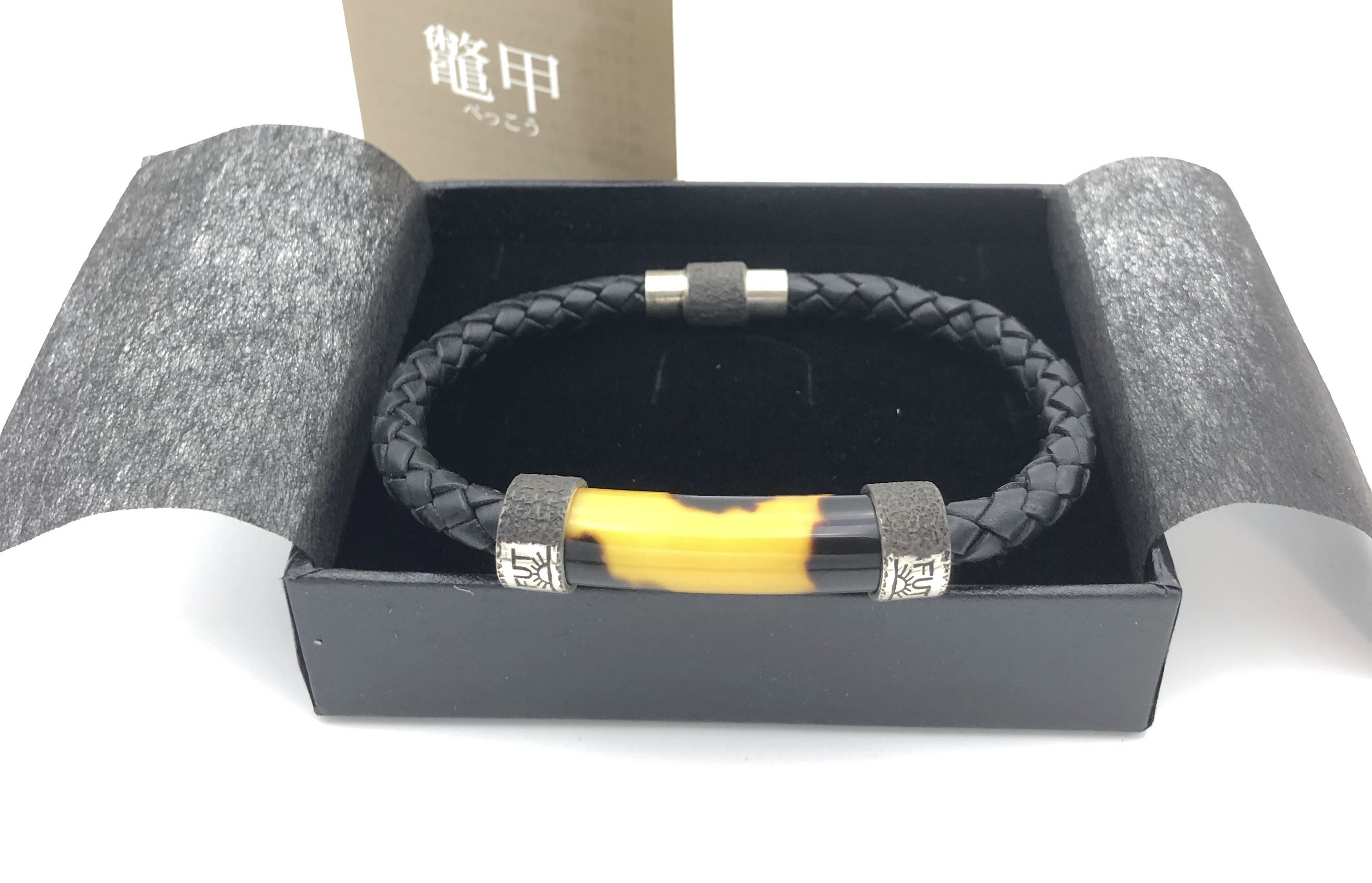 べっ甲の眼鏡は高額すぎる、ループタイは需要が少ない、でも他人(ひと)と違う本物のアクセサリーを身に着けたい、そんな大人の男性に自信をもってお薦め出来るものを作っていきたい。そんな思いで職人たちと考え、べっ甲ならではの軽さと風合いを大切にし、一つ一つ職人が手作業で丁寧に仕上たべっ甲ブレスレット。なにわの名工である職人が一からデザインしたシルバー製の金具とべっ甲職人とのコラボで実現したオンリーワンの商品です。ホンモノの良さを分かっている人にこそ身に着けてほしい。