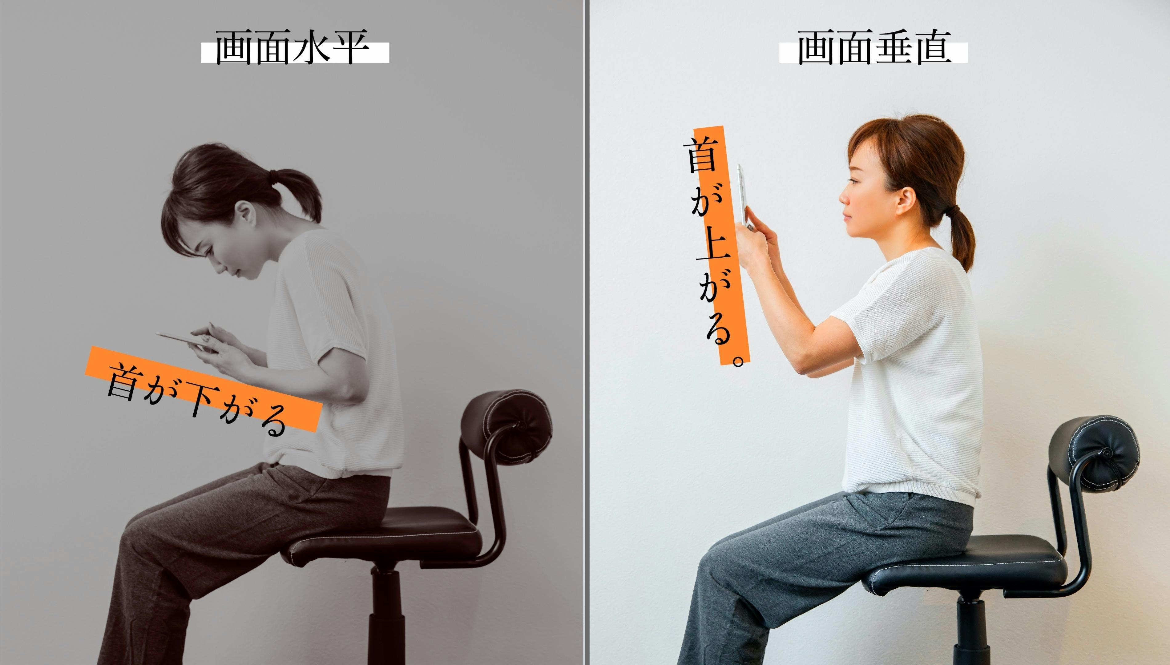 スマホの画面が水平になっていると、首が下がり、首の角度も水平になりやすくなります。画面の角度が垂直になると、姿勢も自然に起きてきます。つまり、画面の角度と首の角度は比例するといえます。
