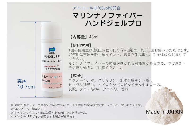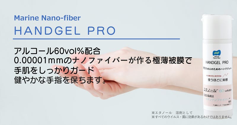今回、みなさまに応援していただきたいのはアルコール60vol%とキチンナノファイバーを配合した「マリンナノファイバーハンドジェルプロ」です。