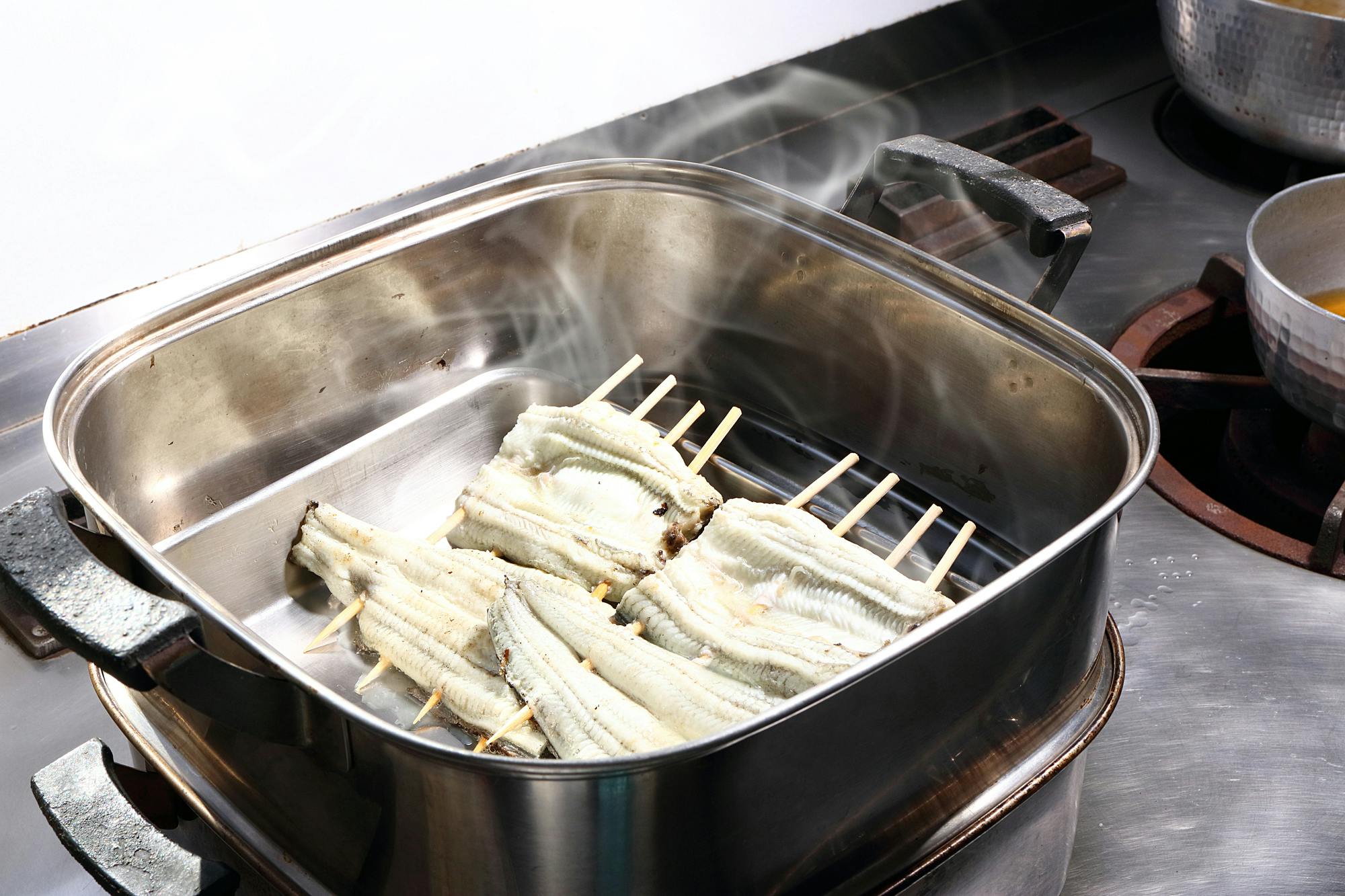 たれに漬けない白焼きを行った後、ふっくらとした身になるように蒸しの工程が入ります