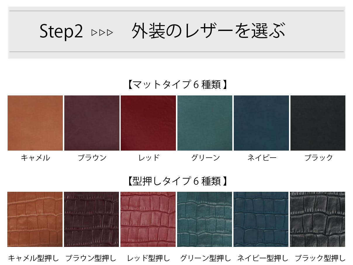 12種類のレザーの中から、好きな色と素材を選んで自分だけのお財布を作ることができます。