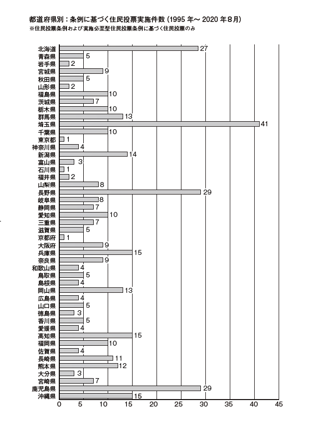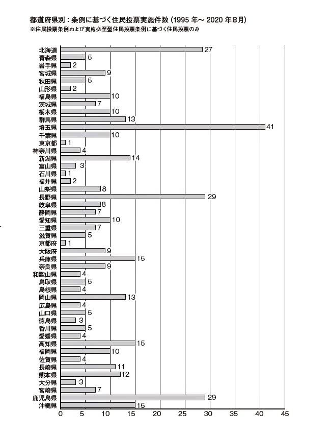 実際、先日の大阪市での住民投票のように、6割~7割の議席を占めている議会内多数派の意向が住民投票で否定された事例はたくさんあります。その一部を紹介しましょう(すべて条例に基づく住民投票で、自治体名は実施当時のもの)。