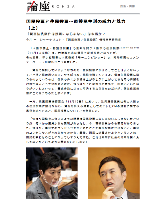 2020/12/31 22:44【朝日新聞「論座」に寄稿】 住民投票・国民投票について、事例の事実、制度の本質を歪めて認識し、否定的な発言をしている人々の誤りを指摘しています。 朝日新聞「論座」に〈上下〉に分けて掲載。ぜひ御一読下さい。しばらくは無料でアクセスできます。 〈上〉は https://webronza.asahi.com/politics/articles/2020122300010.html〈下〉は https://webronza.asahi.com/politics/articles/2020122300011.html もっと見る
