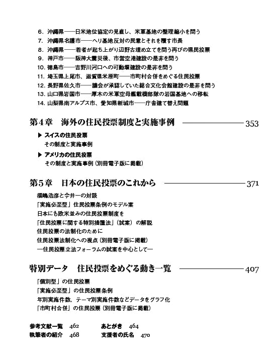 人々に保障される自由及び権利を(憲法第12条にも明記されている)「不断の努力」によって保持するために、多くの人々が本書を手に取り、その地域に生きる人々を信じながら、自ら住民投票、民主主義を、それぞれが暮らす地域で実践していってほしいと思います》
