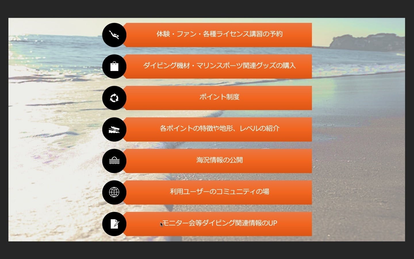 ・ダイバーのレベルに応じたダイビングポイントの紹介(特徴や地形、 生物情報など)                             ・リアルタイムの海況(LIVEカメラや現地からの情報により海況をリア ルに確認できる)