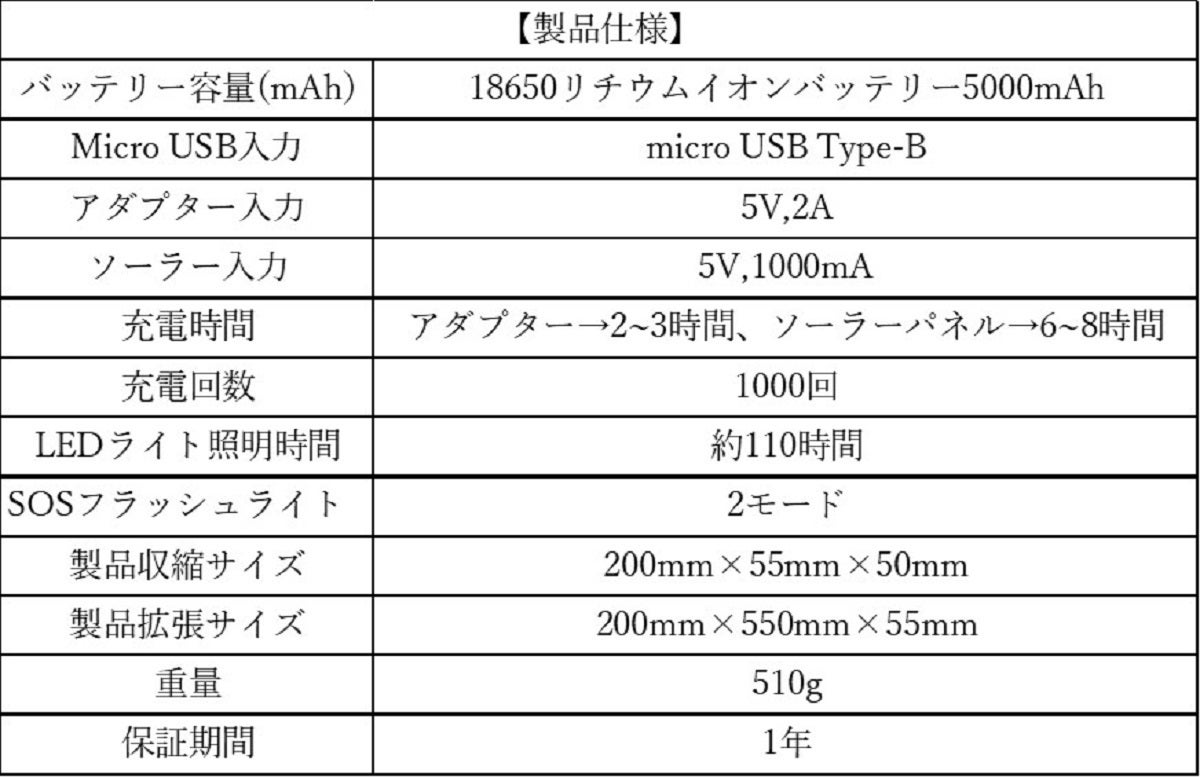 当商品は容量5,000mAhで電力貯蔵装置として高性能リチウム電池を搭載。スマートフォンであれば約2回分充電可能。懐中電灯を備えながらも十分な充電器としての使用できます。出力電圧は5Vで、全ての機種のスマートフォンを充電が可能。