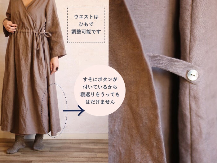 A:洗濯して永く着ていくごとに、肌になじむように生地が柔らかくなります。バースクロスhahagiは、素肌に着ても気にならないリネン生地を使用しています。