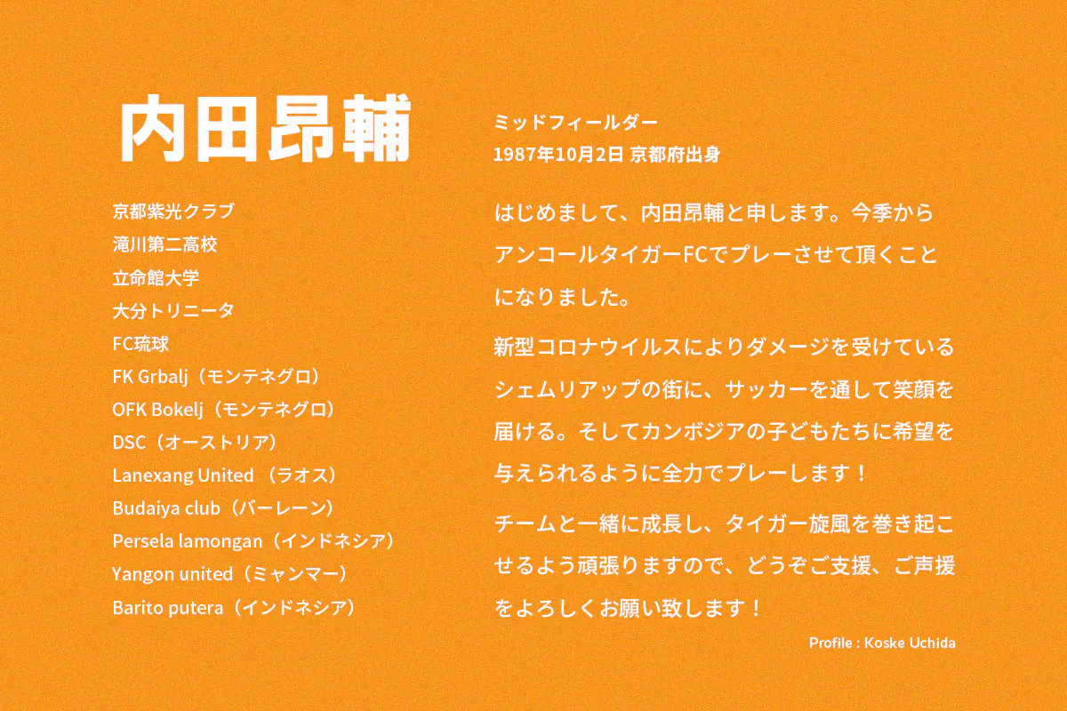 2021/01/19 11:12本日、日本時間21時より「オーナー加藤 × 新加入内田選手」の対談をオンラインにて開催します。日本人選手から見たカンボジア、シェムリアップ、アンコールタイガーFCはどのように見えているのか、オーナー加藤との対談を通して皆様にお届けできればと思います。お時間のある方は是非ご参加ください!※参加無料【日時】2021年1月19日(火)21時〜(20時45分開場)質疑応答含め1時間程度を予定しております。【Zoom URL】時間になったら下記リンクから入場ください。https://us02web.zoom.us/j/89330880500 もっと見る【支援者様限定公開】目標達成しました!皆様、ご協力ありがとうございました!