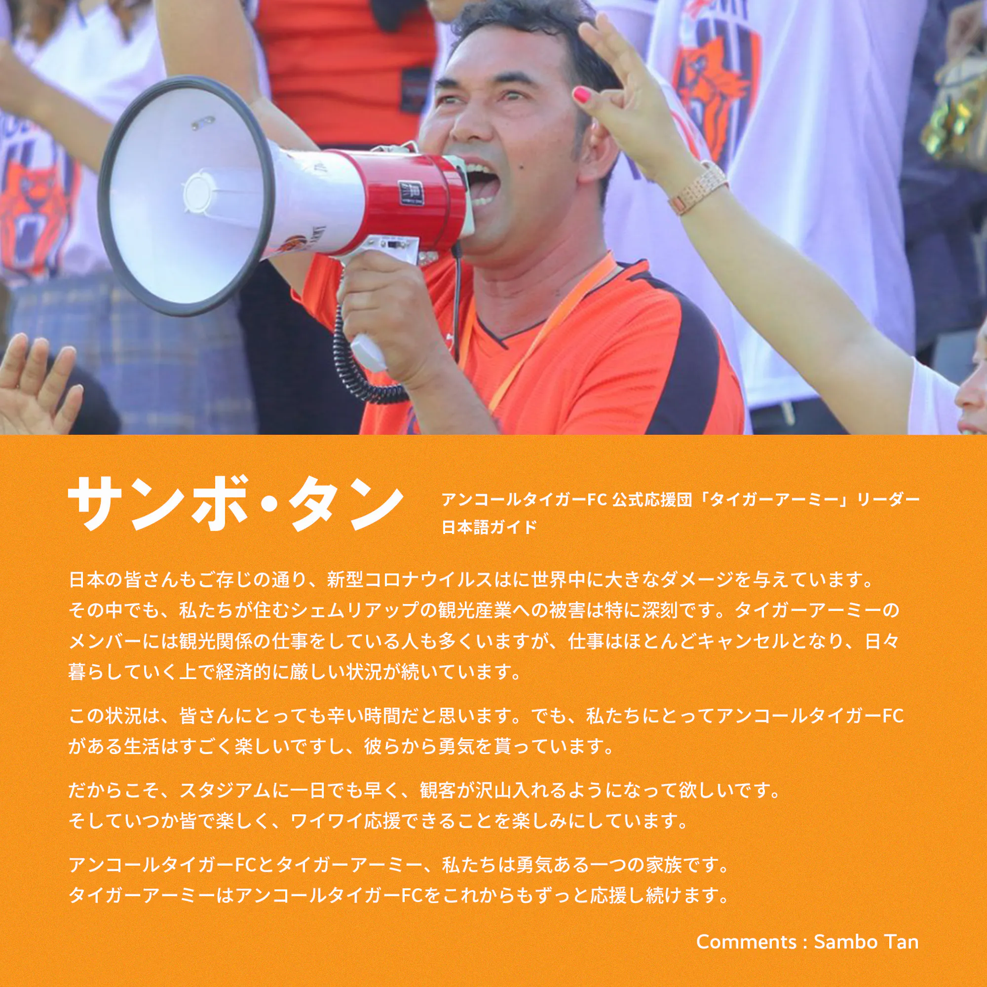 この先どれだけアンコールタイガーFCが強くなっても、勇気、希望、誇り、そして感動を分かち合うサポーターがいなければ、それはクラブが目指す景色ではありません。