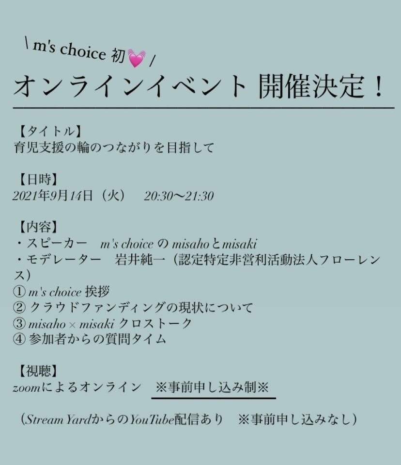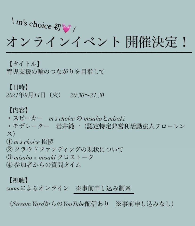 2021/09/07 12:42こんにちは!!m's choice の misaho です!!朝晩だいぶ涼しくなって秋の到来も間近ですね!私たちのクラファンも残すところ1ヶ月!ここから更なる追い込み期間に入ります^_^そこで、今回、認定特定非営利活動法人フローレンスの 岩井純一 様 のご協力もあり、m's choice初のオンラインイベントの開催が決定しました!!!!初のイベントということで緊張もしていますが、皆様と直接お話しできることがすでに楽しみです!当日は予約制(ZOOM参加の場合)になりますので、ご希望の方は私たちのSNSや、HPのお問い合わせコーナーから、ご連絡お願いします^o^その後、詳細を送らせていただきます!では、皆様の参加どしどしお待ちしております♪ もっと見る