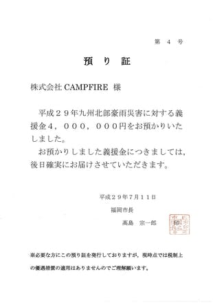 今回、皆様から頂いた資金は義援金として、福岡市に全額寄付させて頂きます。