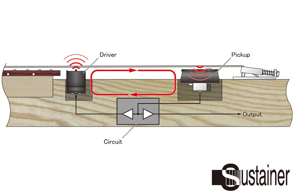 上記図の通り、弦振動はリアピックアップで振動周波数に応じた電気信号に変換されたのち内部のアンプで増幅されてサスティナードライバーに入力されます。