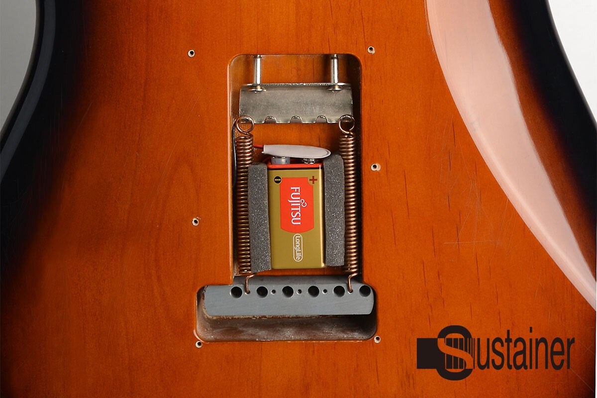 トレモロ搭載機種に関しては乾電池(006P)をスプリングキャビティ内に収納いたします関係上、スプリングは両端の2本での運用となります。このことにより総体的なスプリングテンションが不足してしまいますので、無料にて強弾性スプリング2本に変更させていただきます。なお、トレモロ非搭載機種に関しては有料にてバッテリーボックスの取り付け加工を行わせていただきます。