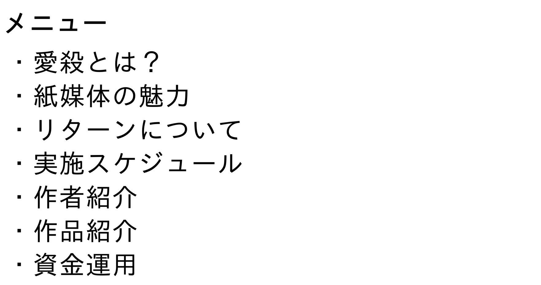 バイブルの三作品には到底及びませんが、どうにか形だけでもあの作品と同じように『単行本』として愛殺を書籍化し、そのリアルな本の感触を確かめたいのです。自分の本がみんなに認められ、求められて『本』になった。その夢を叶えたいです。そして、皆さんにとって愛殺が大切な本の仲間入りを果たし、本棚に飾ってもらえたらこの上ない喜びです。愛殺を他の商用作品に負けないくらい魅力的な本として、皆さんに受け取って読んでいただきたいのです……!!