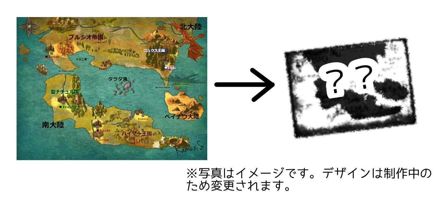 B6程度の紙に表面は地図イラストを、裏面は地図に関する設定をまとめる予定です。茶色いクラフト紙等に家庭用印刷機で印刷予定です。地図イラストは新たに白黒デザインで書き下ろしする予定です。