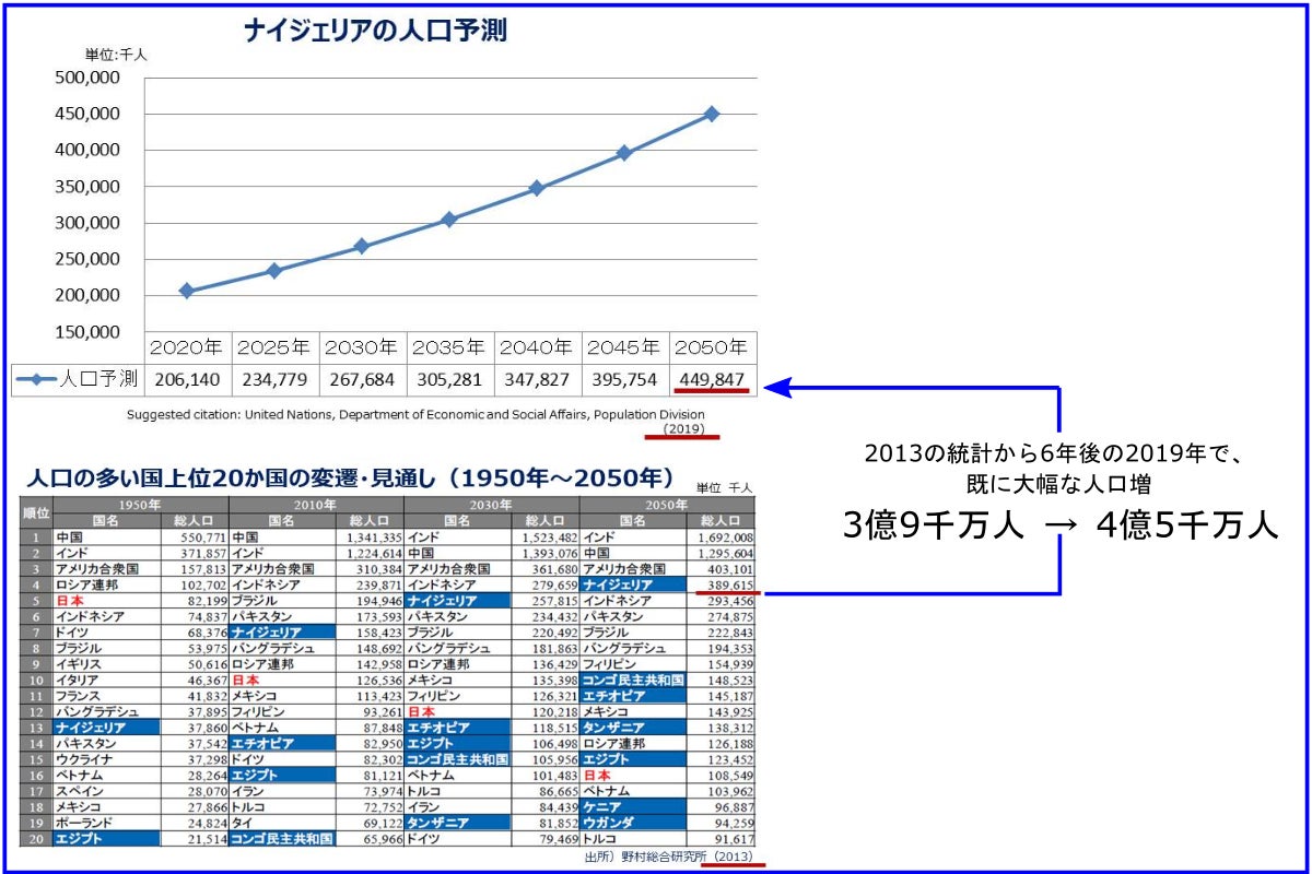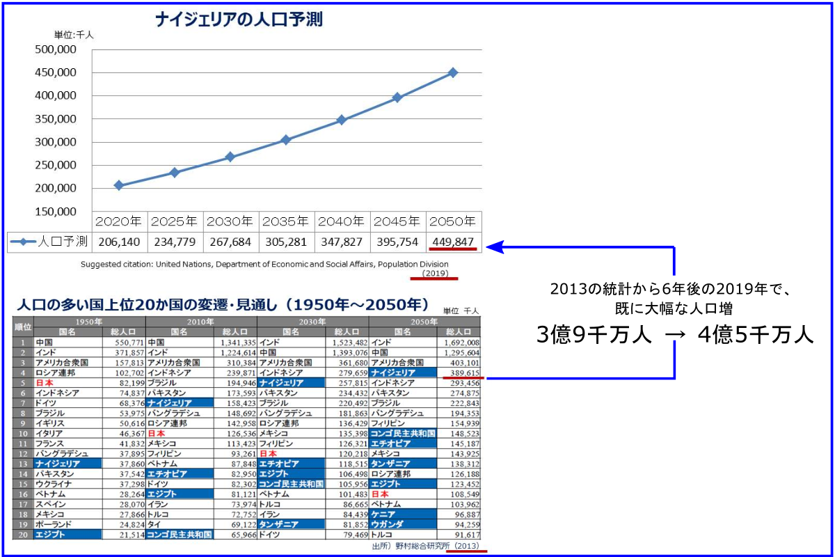 西アフリカに位置し、ナイジェリアの人口は現在2億人弱でアフリカ最大、2050年には4億5千万人の人口(世界第3位)になると言われています。面積は923,773平方キロメートルで日本の約2.5倍。公用語は英語、主な産業は農業、原油、天然ガスなどです。
