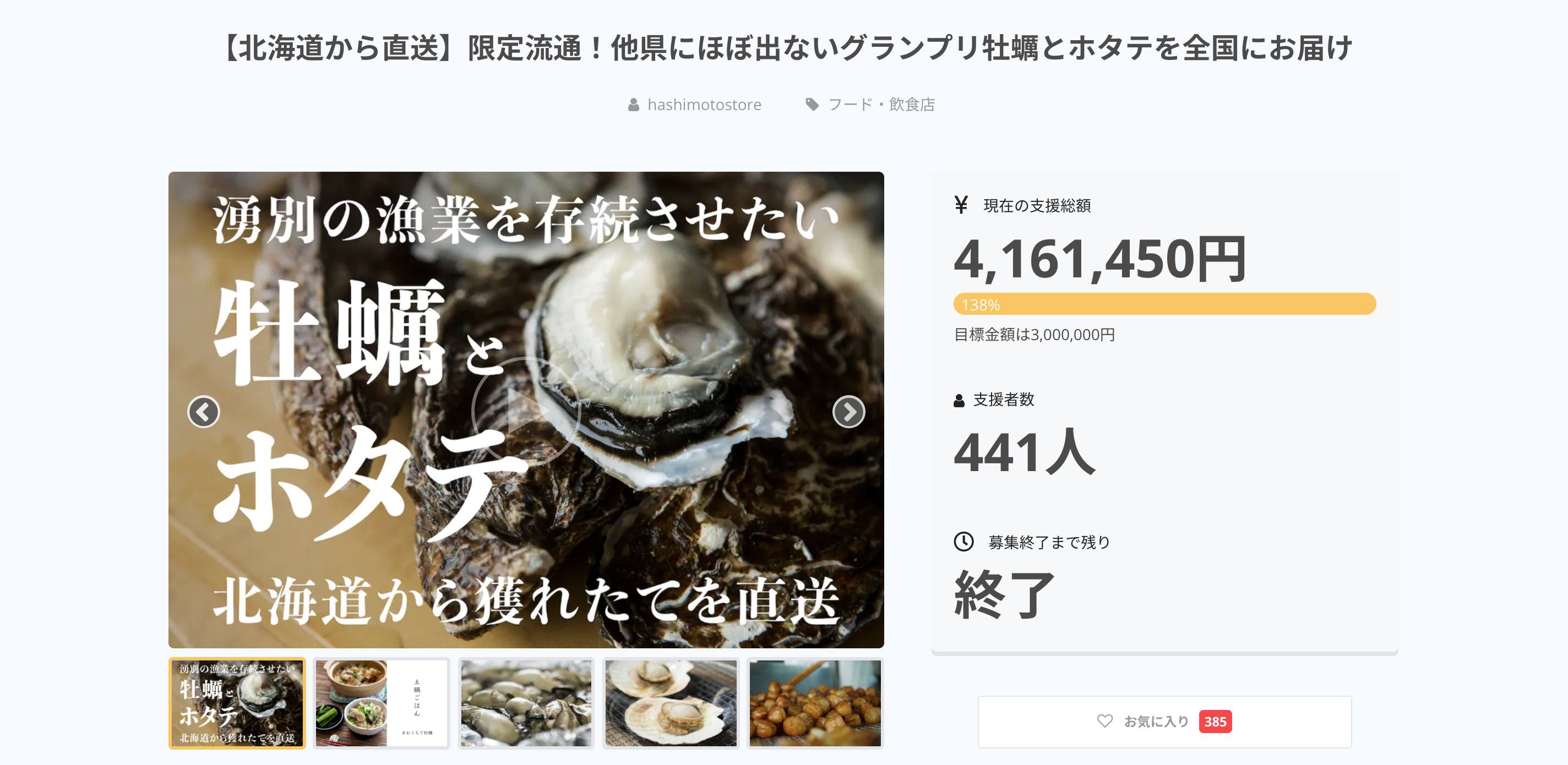 2021/01/20 07:58おはようございます、橋本です。今回は同じ内容で2回目のプロジェクトになりましたが、第1回、第2回の両方とも御支援してくださる方がいたり、沢山の方々に支えられ、160万円以上の御支援をいただけたこと心より感謝いたします。誠にありがとうございました。北海道もいつ緊急事態宣言が出てもおかしくない状況で、雪まつりも中止になり、物流が停滞している状況にも関わらず、湧別サロマ湖産カキや、カネショウウスイの珍味など多くの方にお届けできるのが本当に嬉しく思います。お近くのスーパーやデパートなどで、北海道産や湧別産などを見かけた時は、1つでも2つでも構いませんので、商品をご購入していただければなと思っております。この度は、本当にありがとうございました。 もっと見る