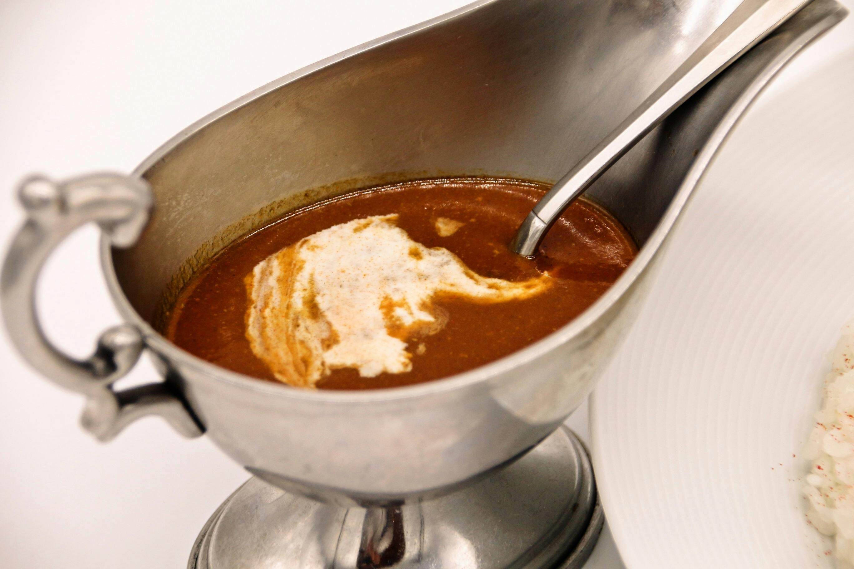 活きのオマール海老の頭やミソだけでなく身もソースに使い濃厚な旨味を出し、香味野菜の香りや自家製スパイスで味を調えた特別なカレーです。