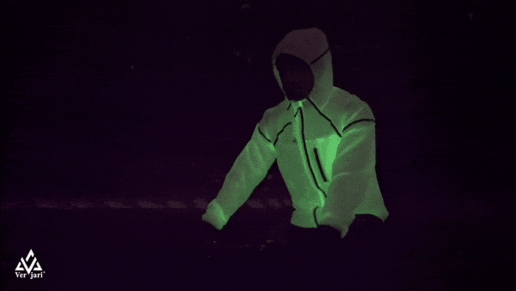 『Firefly Jacket (ファイヤーフライジャケット)』は、自ら蓄光・発光するジャケット。単純な反射とは異なり、事前に蓄光しておけば外からの光がなくても自ら発光します。