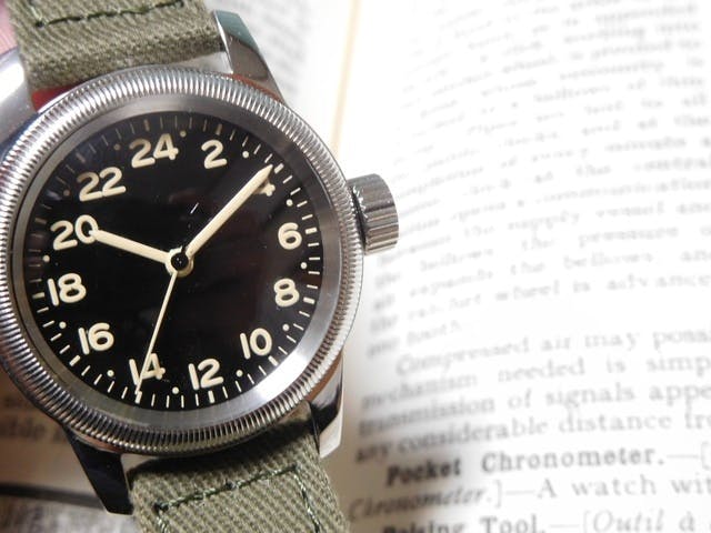 第二次世界大戦でアメリカ陸軍航空隊が使用したTYPE A-11 24H。こちらは珍しい、24時間で時針が1周する24時間時計です。現在日本のクオーツムーブメントでは24時間ムーブメントを製作していない為、スイスRONDA社の505.24Hムーブメントを使用して、針形状に工夫を凝らし製作しました。インデックスの数字表記と針はアンティークぽさを出すために少し茶色っぽい色にしました。