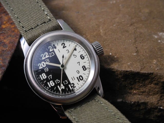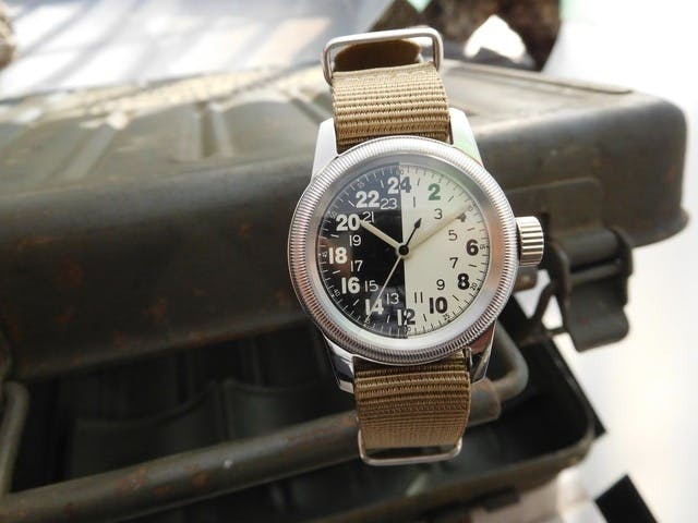 エルジン社の傑作ミリタリーウオッチとの誉も高く、ミリタリーウオッチの専門書でも表紙を飾る人気モデルです。午前と午後を白と黒に塗り分ける事によりパイロットウアナビゲーター達にとっては実に視認性が高く使いやすい。パイロット用時計に作られたAコード最後の時計コインベゼルによって復刻。正確には少しアンティークさを出し白ではなく少しクリームっぽい白と黒の文字盤になります。