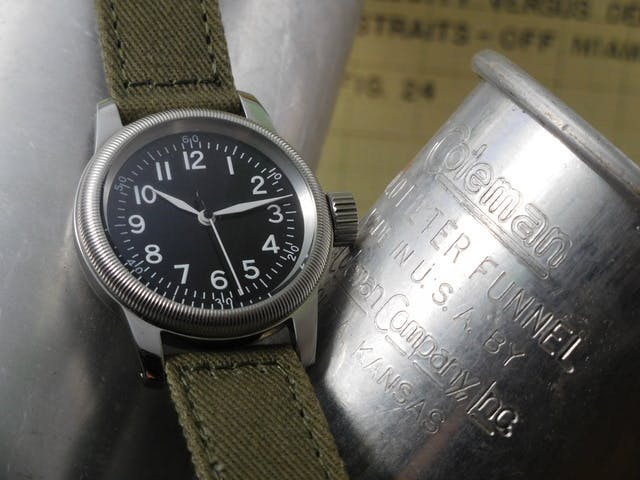 パイロット用ナビゲーション(ハック)ウオッチTYPE A-11。1937年に試作デザインが完成したTYPE A-10が採用される事なく、それに代わり同年10月より採用されたパイロット用腕時計。エルジンの他、ブローバ、ウォルサムを中心に製造され、第二次世界大戦に米陸軍航空隊での代表的なモデルでもあるTYPE A-11。最もアメリカ陸軍航空隊が調達したモデルであるだけあり文字盤の種類も多種に渡ります。また海軍タイプ(R88-W-800 Dust proof Navigation watch)も製造される程でした。
