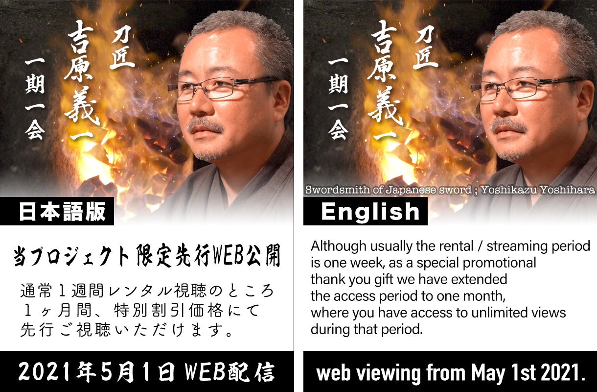 「刀匠・吉原義一 一期一会」映像化プロジェクト参加者(支援者)として、個人お名前入れ・エンドクレジットのプラン。および、通常パッケージ版DVD、もしくは、桐箱職人によるオリジナル桐箱DVDBOX入りDVD。