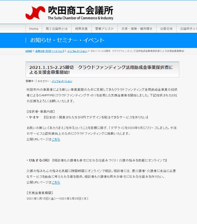 今回「けあするオンライン」、大阪府吹田市・吹田商工会議所の支援事業として、クラウドファンディングに挑戦しています。