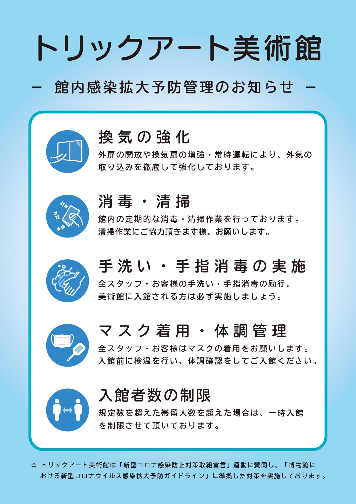 トリックアート美術館ではお客様とスタッフの健康と安全を最優先に考えて営業しております。徹底した感染拡大予防対策を行い、皆様と共に新しいアートの楽しみ方、思い出の作り方を作り続けて参ります。ご来館の際には、以下の事項をお守り頂けます様、お願い致します。
