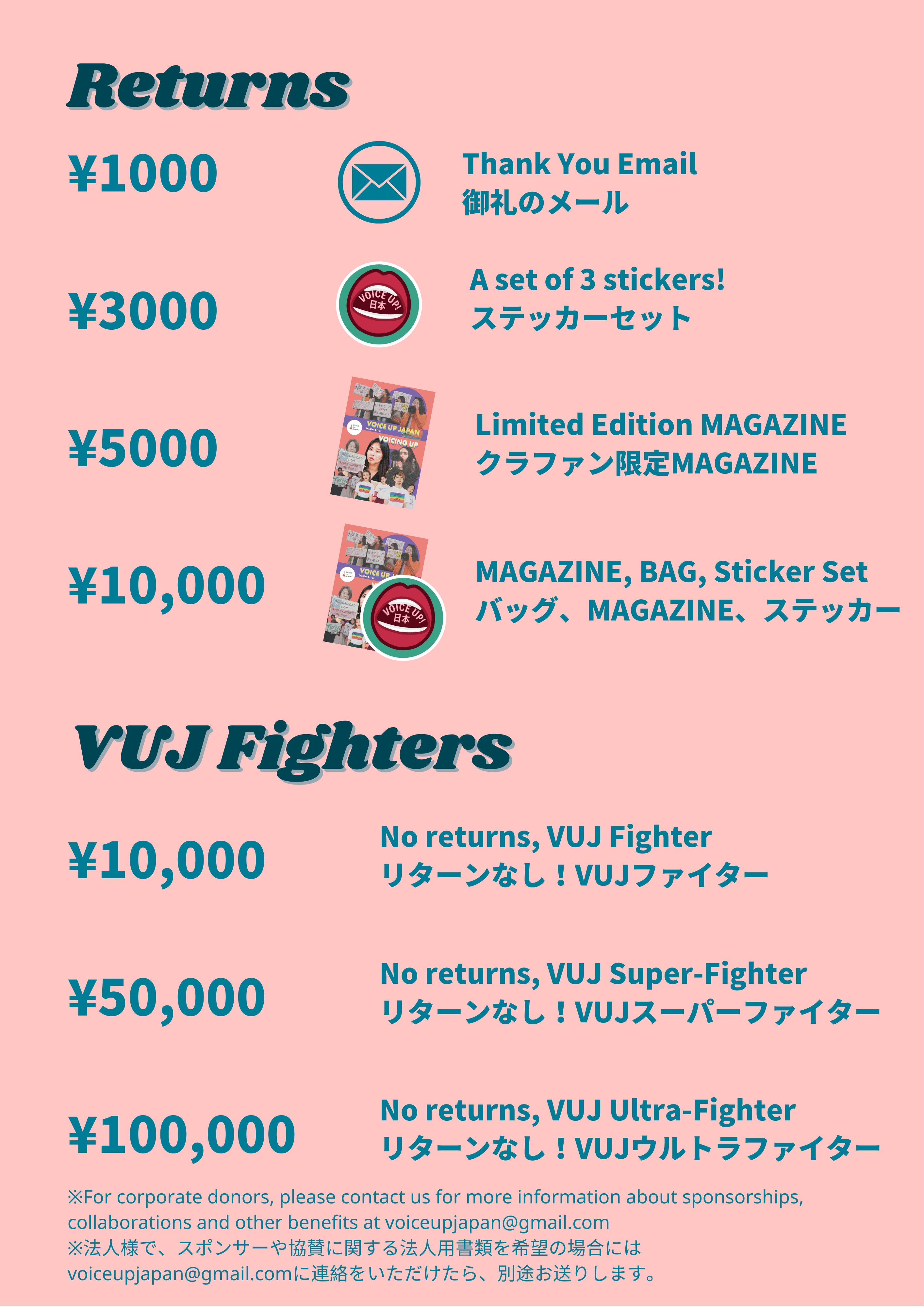 ※For those who want to know more about sponsorships and collaborations, please contact voiceupjapan@gmail.com to receive more information. Once the Crowdfunding ends, we will send each enterprise/organization an email regarding more information. Please make sure you have your company/organizational logo ready in .ai and .jpg/.png.