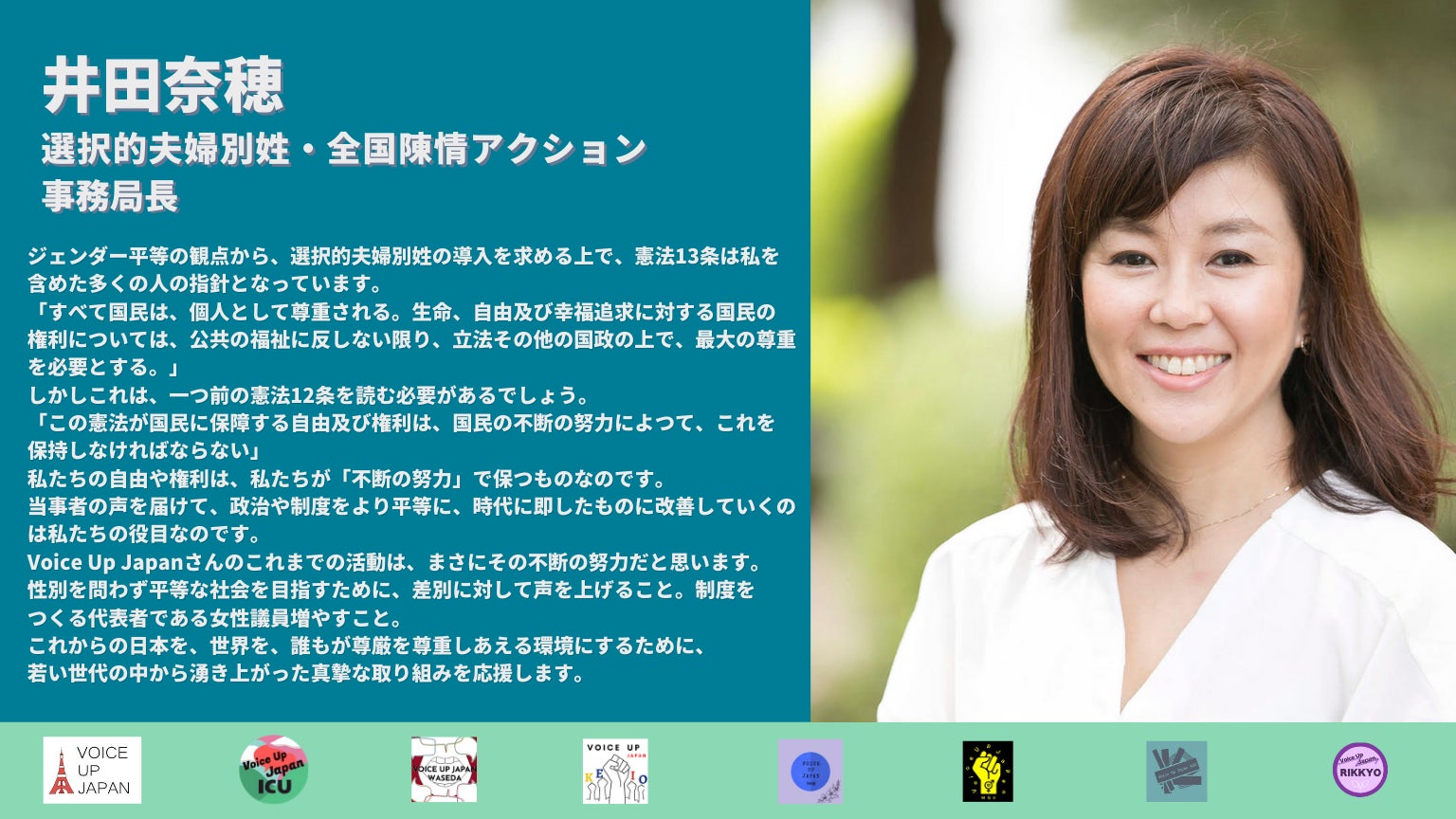 Voice Up Japan is an organization founded by Kazuna Yamamoto in 2019 after starting a petition against a tabloid magazine that created a ranking of universities with female students that are easy to approach for sex.
