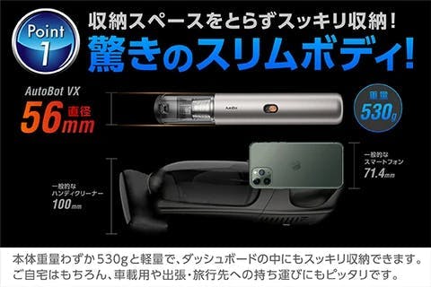 ご自宅のお掃除にはもちろん、車載用クリーナーとしても活躍する「AutoBot VX」。コンパクトかつスリムな設計なので、ダッシュボードの中やコンソールサイドポケットにもスッキリ収まり収納場所をとりません。