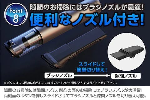 ノズル両側面のボタンを押しながらスライドさせるだけで、ブラシノズルがあっという間に隙間ノズルに早変わり。付け替えの必要が無いのが嬉しいですね。