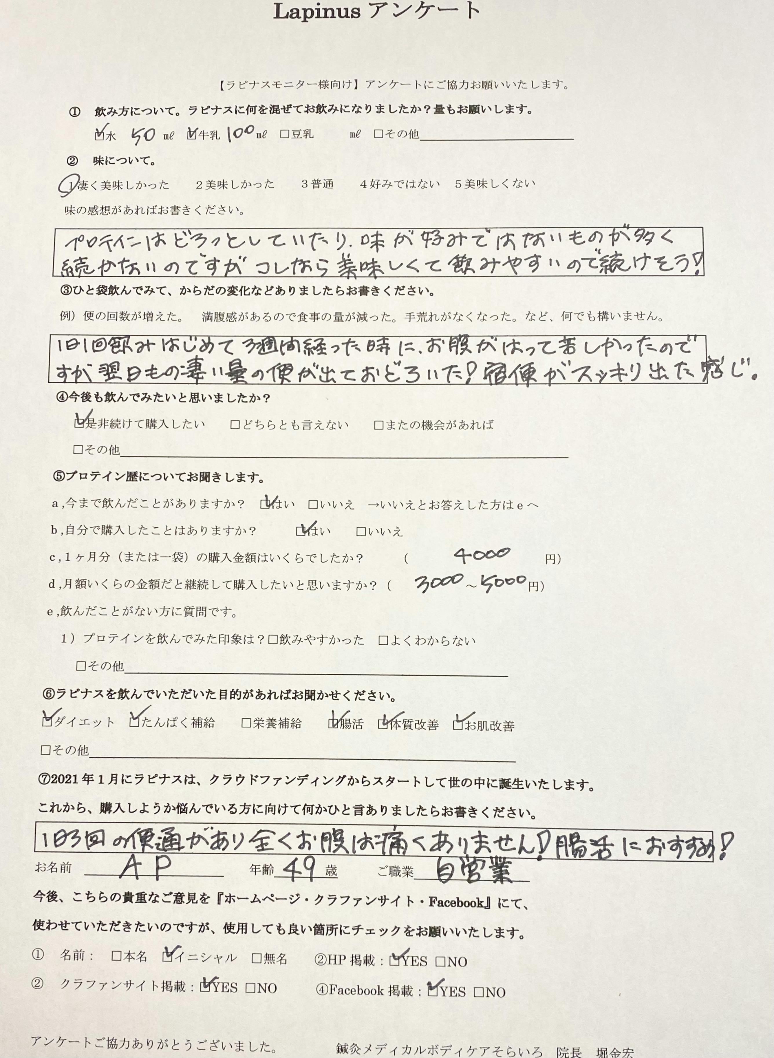 2021/02/03 12:34『達成率200% 77名の支援者 1,003,276円』”プロテインLapinus(ラピナス)で腸活”のクラウドファンディングが終了いたしました。沢山の方から叱咤激励をいただきながら最後まで全力で進むことができました。改めて応援していただいた皆様に感謝申し上げます。 私のチャレンジはこれからが本番になります。全国の皆様に知っていただきラピナスを飲んで健康に人生を過ごしていただくことがこのプロテインを作ったキッカケになります。今後の活動のためにも、ラピナスを飲んだ感想やご質問をいただけると大変嬉しいです。 今後の新たな情報などもお知らせさせていただきたいと思っております。 これから皆様の健康をサポートさせていただくためにお付き合いいただけましたら幸いです。現在、リターン品をお届けする準備を進めております。もうしばらくお待ち下さい。今回、ご支援いただいた皆様応援ただいた皆様。ありがとうございました!これからも走り続けます。鍼灸メディカルボディケアそらいろ 院長 堀金宏 もっと見る