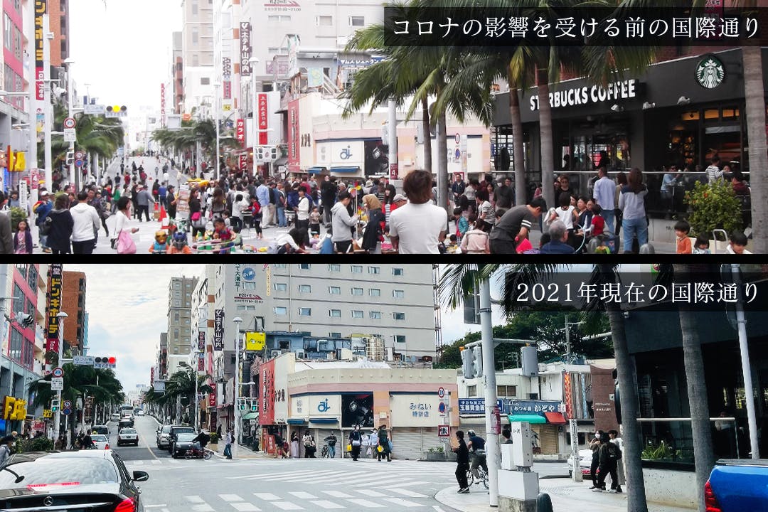 コロナ禍の中、国際通りを訪れる方々の減少は、今もなお続いています。下記は、コロナの影響を受ける前の国際通りと2021年2月に撮影した国際通りの状況です。