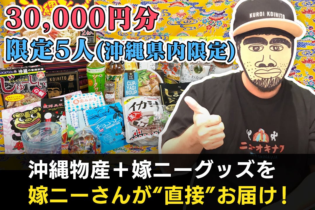 日本テレビ系人気番組「月曜から夜ふかし」で一躍人気者となった「嫁ニー」こと平良司さんより、自身が国際通りで運営している飲食店のお得な食事券や自身が自らリターン品をお届けするプランなど