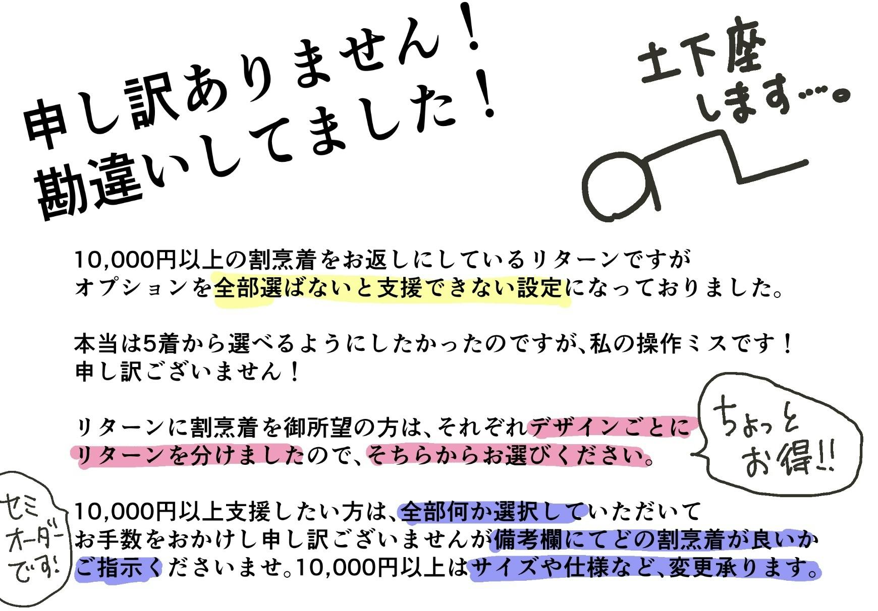 2021/05/26 09:47先日はたくさんのご支援誠にありがとうございます!みなさんのご支援金と、自己資金で念願の楽天ショップをオープンする運びとなりました。https://www.rakuten.co.jp/kappougi-ten/現在、商品数はたったの2点(涙)他のデザインは今頑張って職人様に作っていただいております。ありがとうございます!商品が出来上がったら随時報告します。これからもどうぞよろしくお願い申し上げます。 もっと見る
