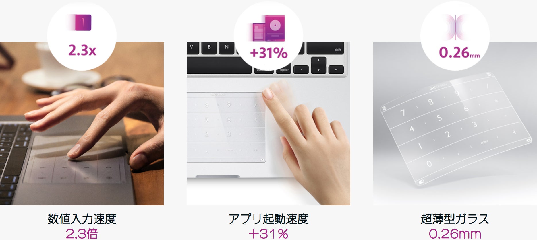 「アルミノシリケートミネラルガラス」というアメリカNASAのスペースシャトルの窓ガラスにも使われている素材を使い、トラックパッドの保護カバーとして高い強度・機能をもたせることに成功しました。