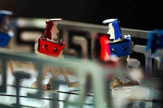 フィールド上で、ゴールキーパー、ディフェンダー、フォワードの3人を動かし、黒い小さなホッケーパックをゴールに決めてください。